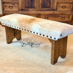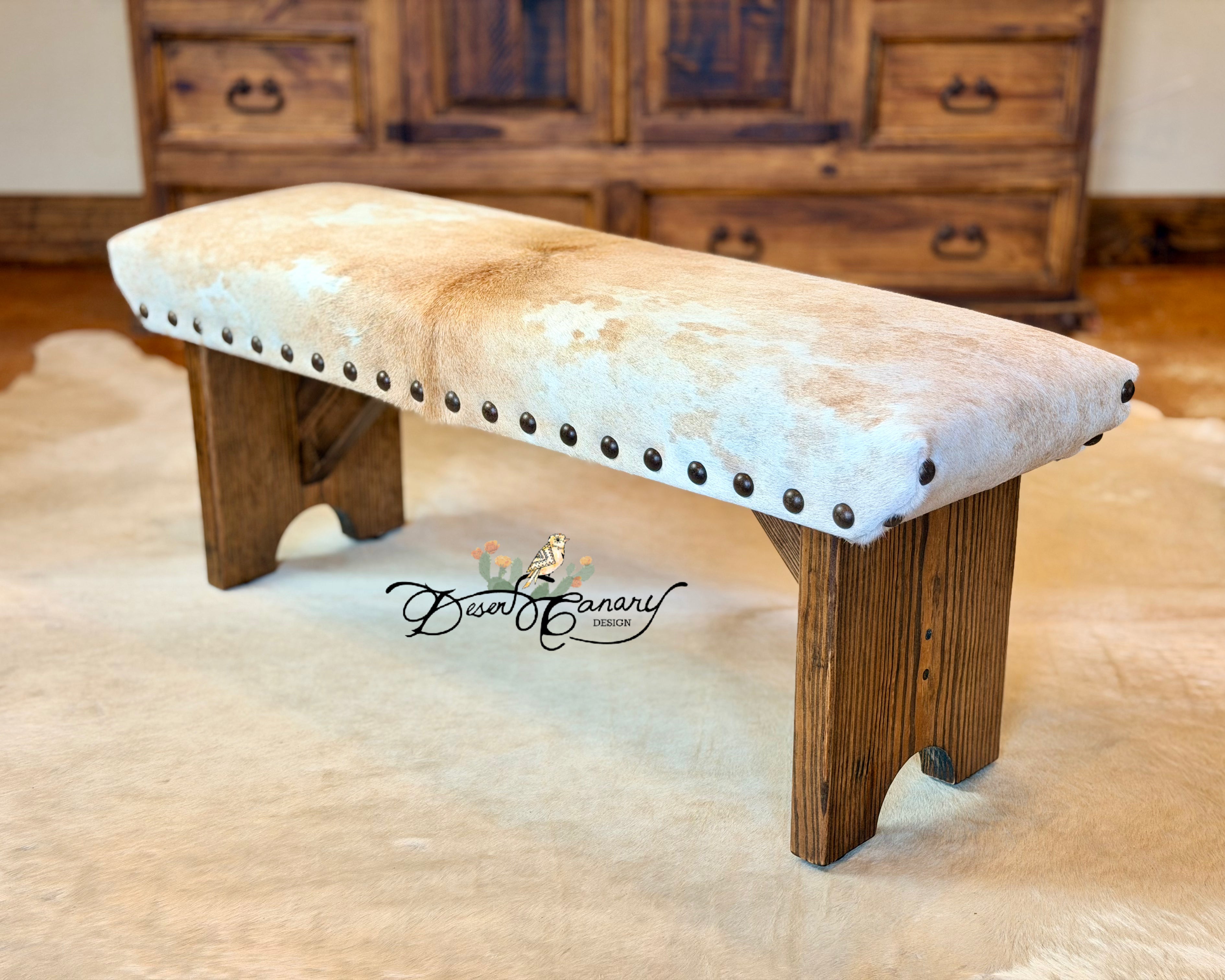 Desert Canary Design’s best-selling signature cowhide bench is a classy and timeless rustic piece of furniture that seamlessly blends western sophistication with natural charm.  Handcrafted to perfection, this bench features a sturdy wooden frame that promises durability and stability, ensuring years of reliable use.  The standout feature of this bench lies in its exquisite upholstery, meticulously handcrafted from premium Brazilian cowhide.  Each cowhide is thoughtfully curated taking into consideration pattern, texture, and color, ensuring an element of individuality to every bench.  The Cowhide Bench serves as much more than just an eye-catching accent; it also offers comfort and practicality.  The padded seat, generously cushioned with 1 inch high-quality foam, provides an inviting spot to sit.  Whether it’s used as a comfy spot to remove boots, a statement piece in the entryway or end of the bed, the Cowhide Bench is the epitome of beauty, craftsmanship, and functionality – a true representation of the harmonious coexistence of nature and design.