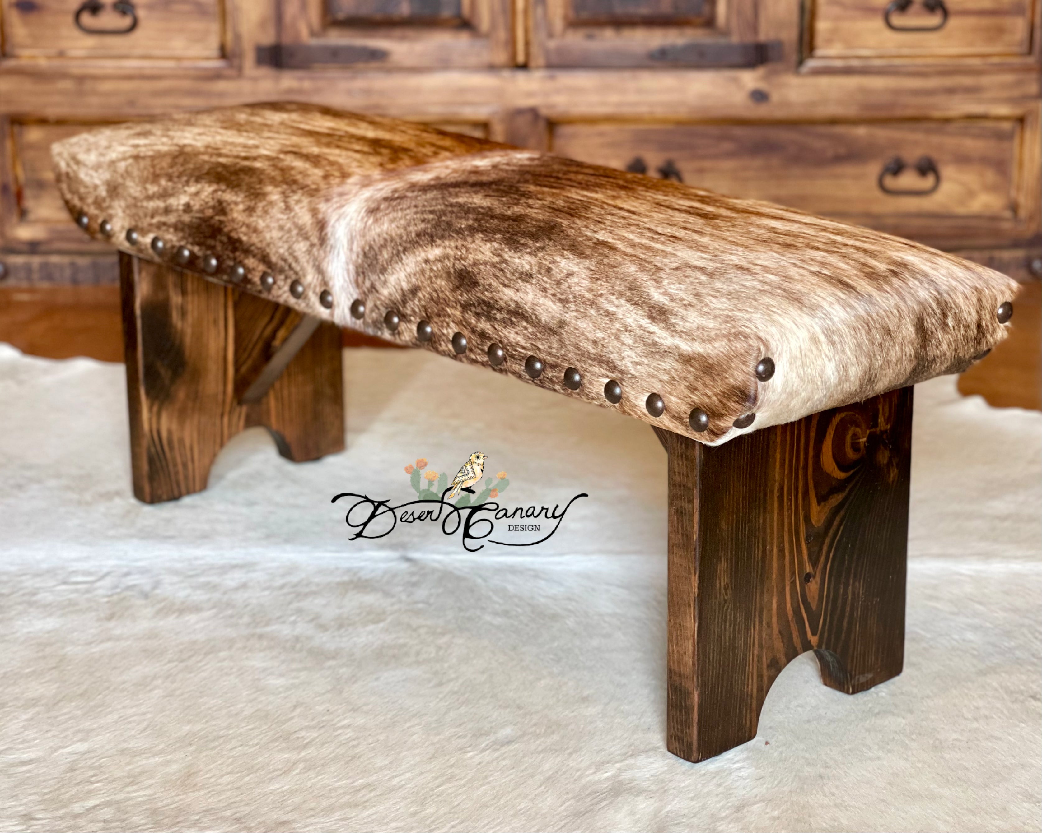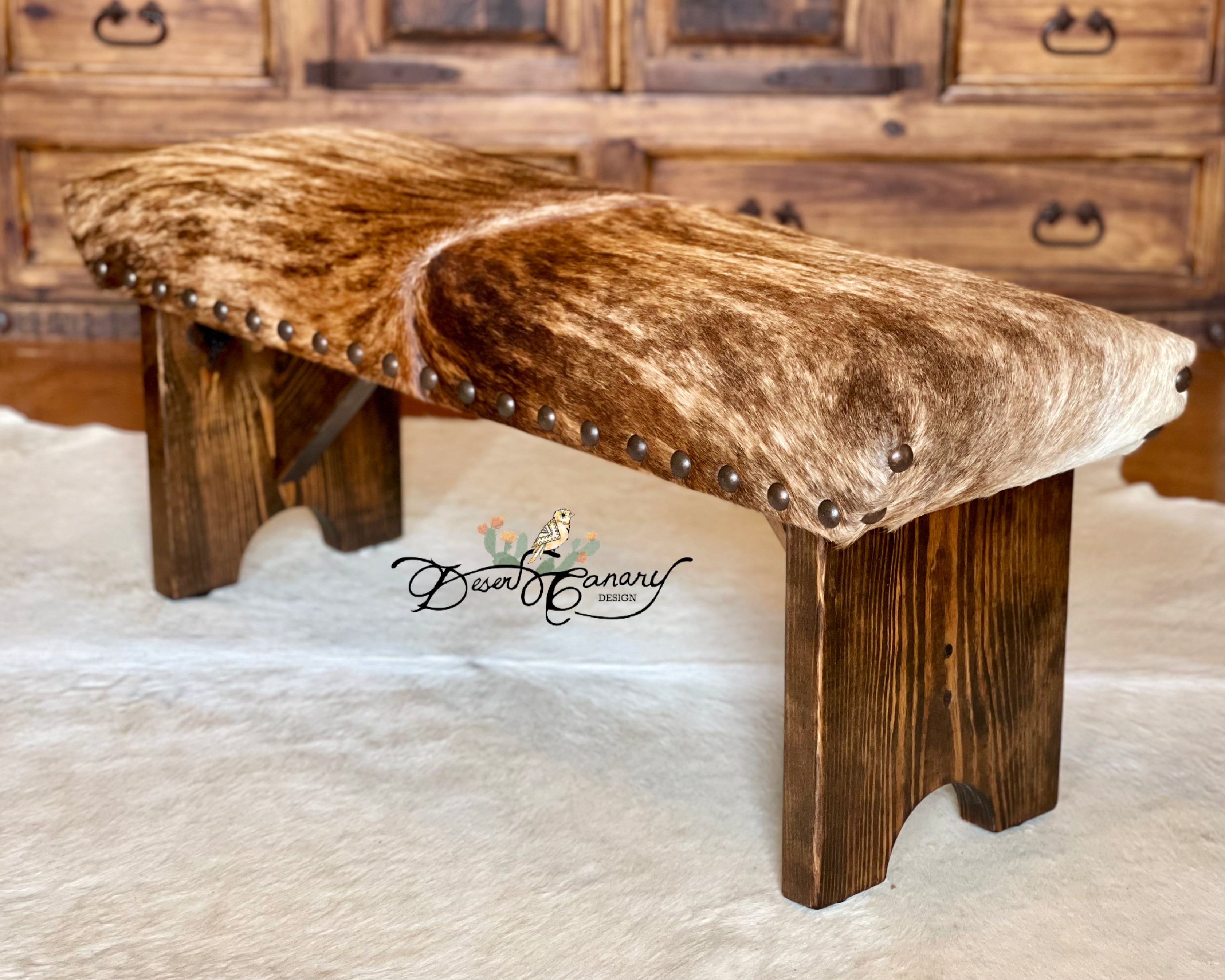 Desert Canary Design’s best-selling signature cowhide bench is a classy and timeless rustic piece of furniture that seamlessly blends western sophistication with natural charm.  Handcrafted to perfection, this bench features a sturdy wooden frame that promises durability and stability, ensuring years of reliable use.  The standout feature of this bench lies in its exquisite upholstery, meticulously handcrafted from premium Brazilian cowhide.  Each cowhide is thoughtfully curated taking into consideration pattern, texture, and color, ensuring an element of individuality to every bench.  The Cowhide Bench serves as much more than just an eye-catching accent; it also offers comfort and practicality.  The padded seat, generously cushioned with 1 inch high-quality foam, provides an inviting spot to sit.  Whether it’s used as a comfy spot to remove boots, a statement piece in the entryway or end of the bed, the Cowhide Bench is the epitome of beauty, craftsmanship, and functionality – a true representation of the harmonious coexistence of nature and design.