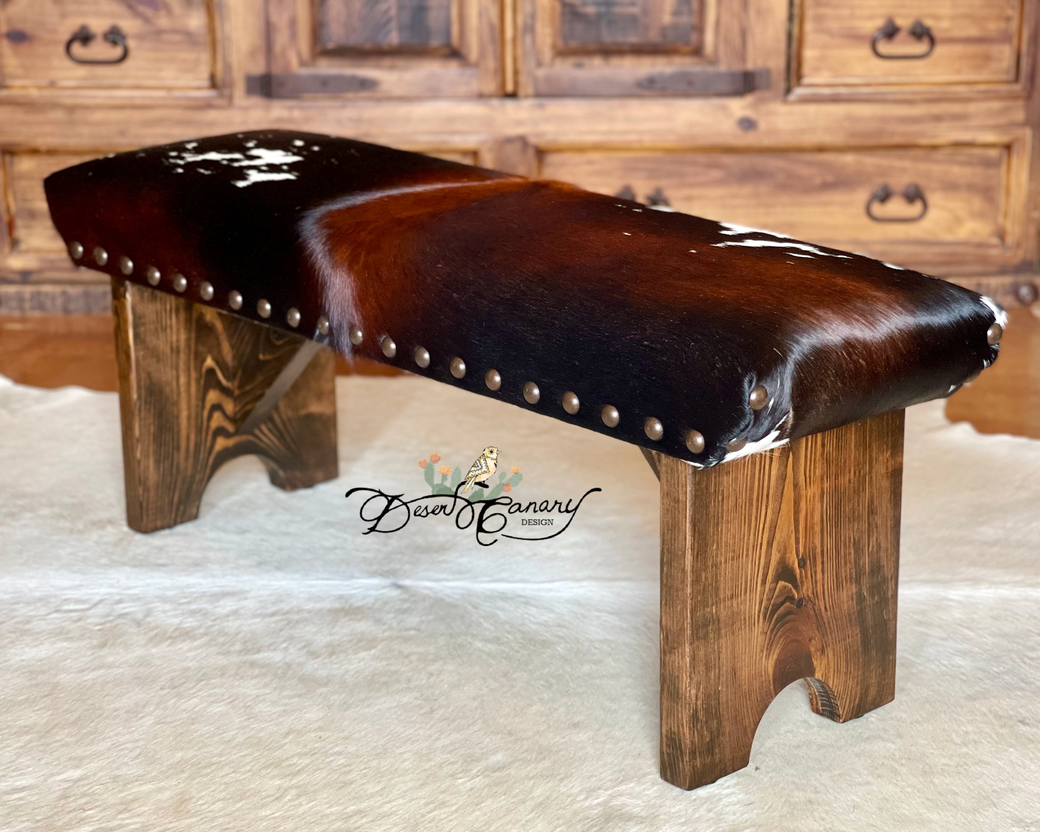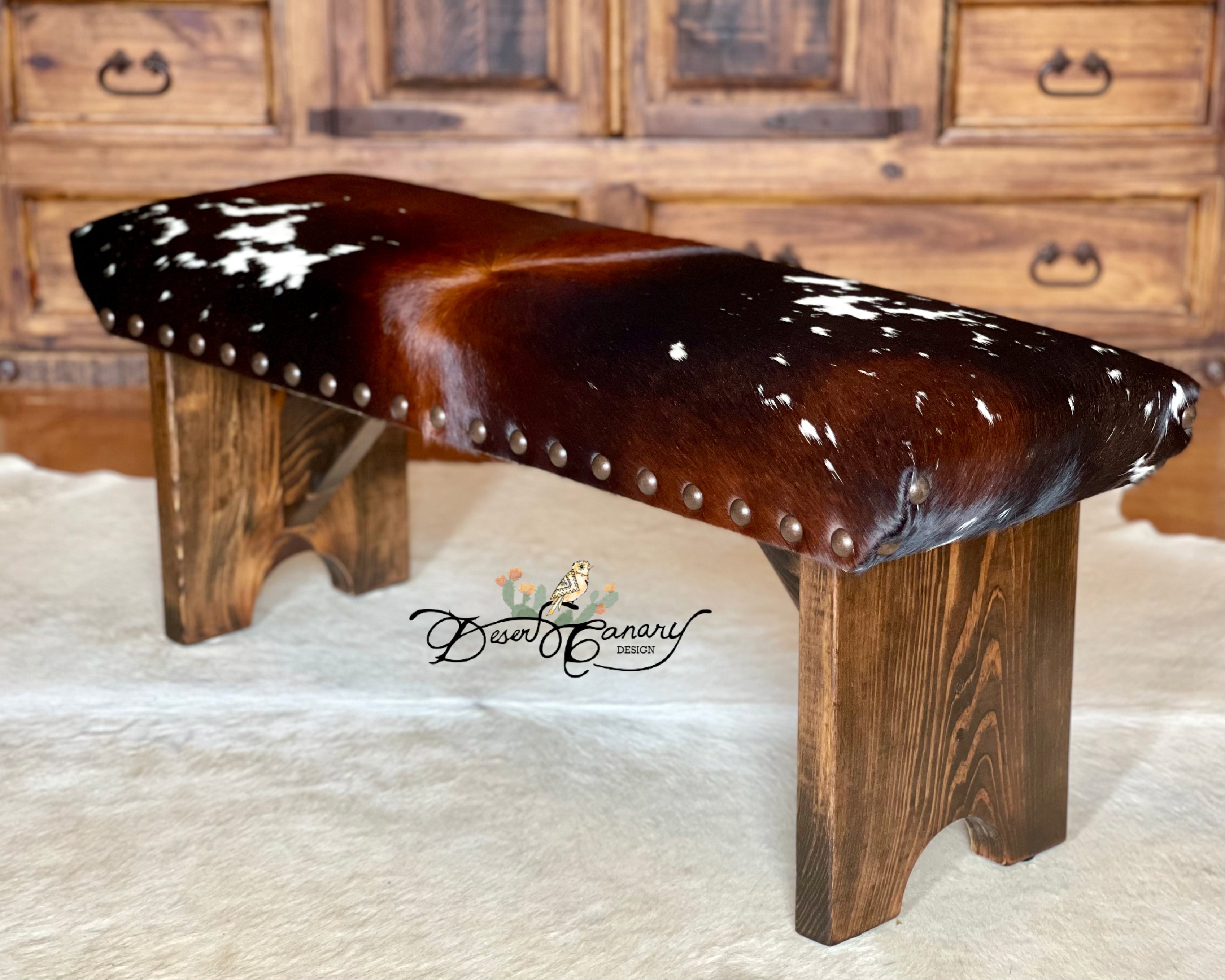 Desert Canary Design’s best-selling signature cowhide bench is a classy and timeless rustic piece of furniture that seamlessly blends western sophistication with natural charm.  Handcrafted to perfection, this bench features a sturdy wooden frame that promises durability and stability, ensuring years of reliable use.  The standout feature of this bench lies in its exquisite upholstery, meticulously handcrafted from premium Brazilian cowhide.  Each cowhide is thoughtfully curated taking into consideration pattern, texture, and color, ensuring an element of individuality to every bench.  The Cowhide Bench serves as much more than just an eye-catching accent; it also offers comfort and practicality.  The padded seat, generously cushioned with 1 inch high-quality foam, provides an inviting spot to sit.  Whether it’s used as a comfy spot to remove boots, a statement piece in the entryway or end of the bed, the Cowhide Bench is the epitome of beauty, craftsmanship, and functionality – a true representation of the harmonious coexistence of nature and design.