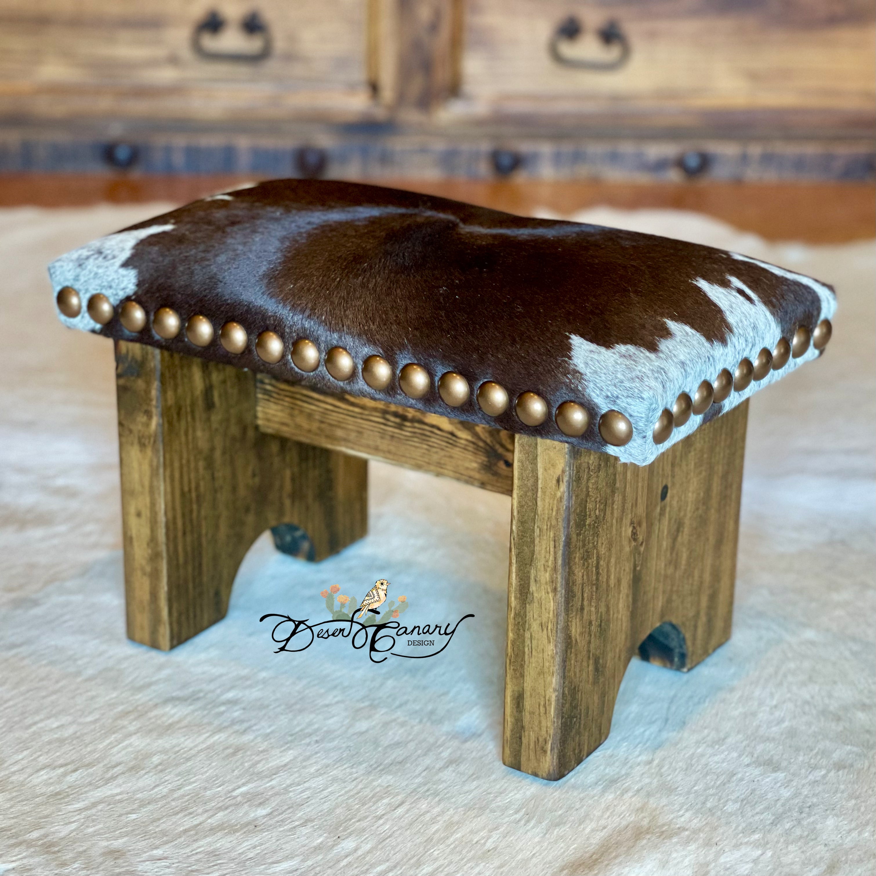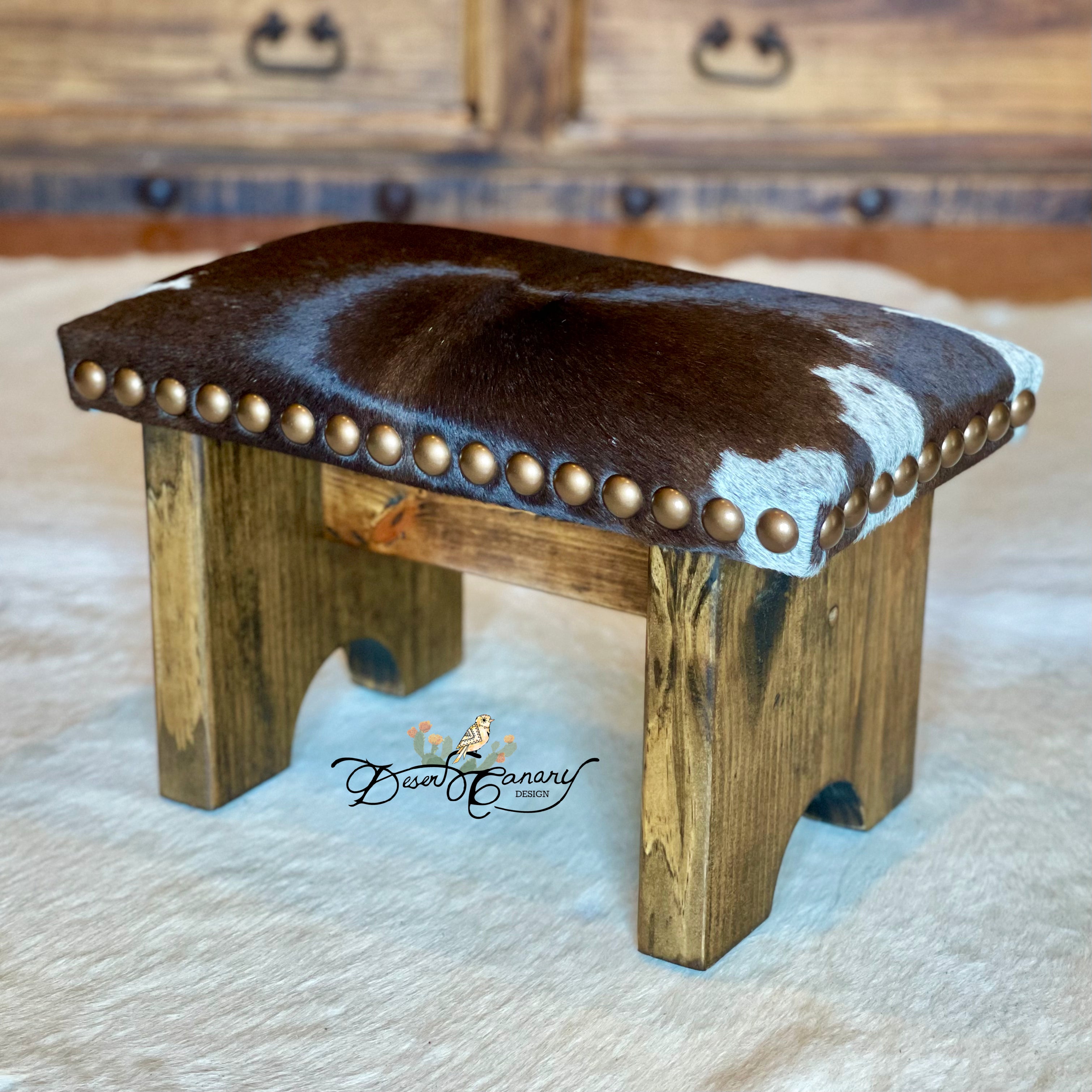 An original design from the Desert Canary Design Bench Shop, the Cowhide Step Stool is the epitome of western style and true functionality.  Born from necessity, this beautiful little workhorse of a stool will soon be one of the most used pieces of furniture in your home.