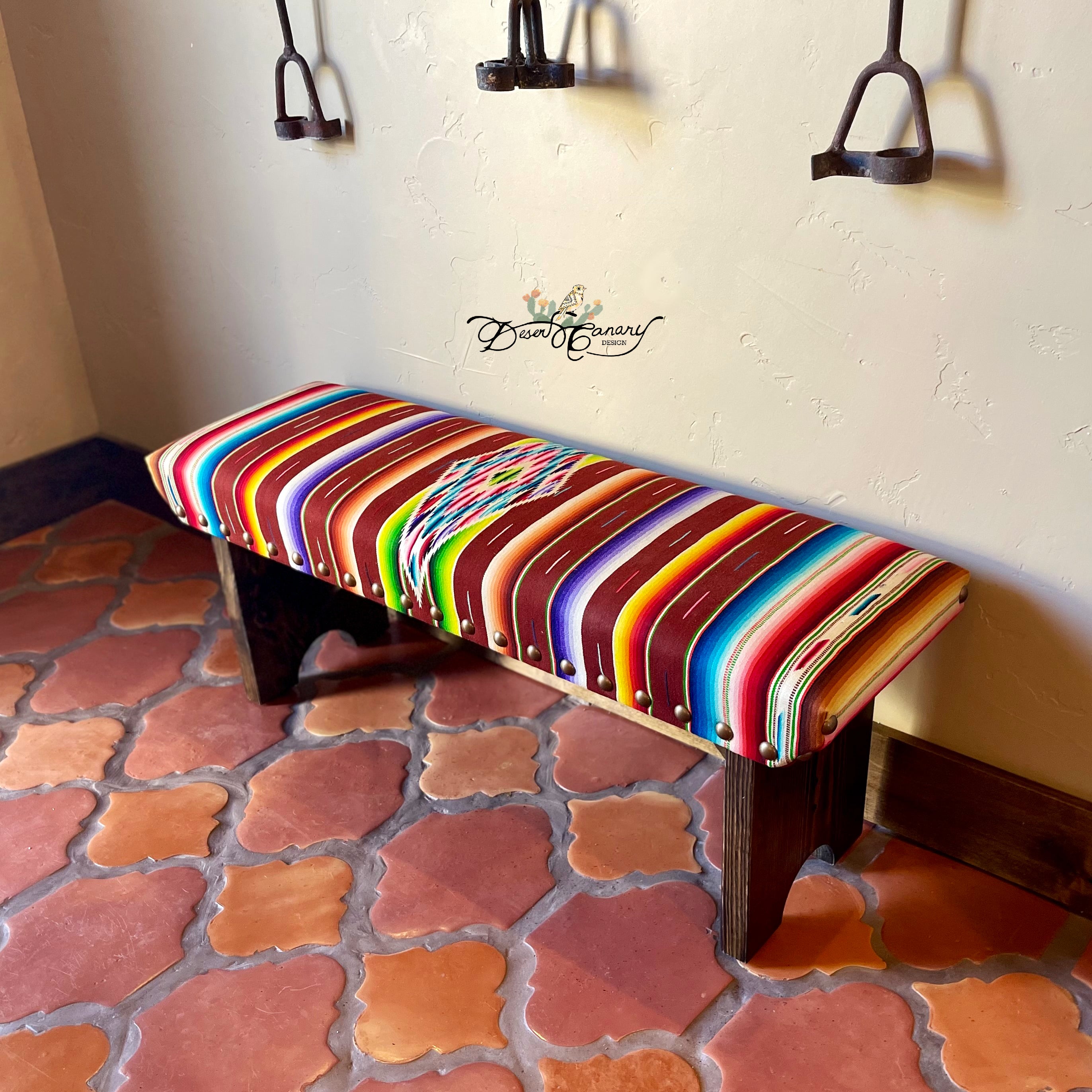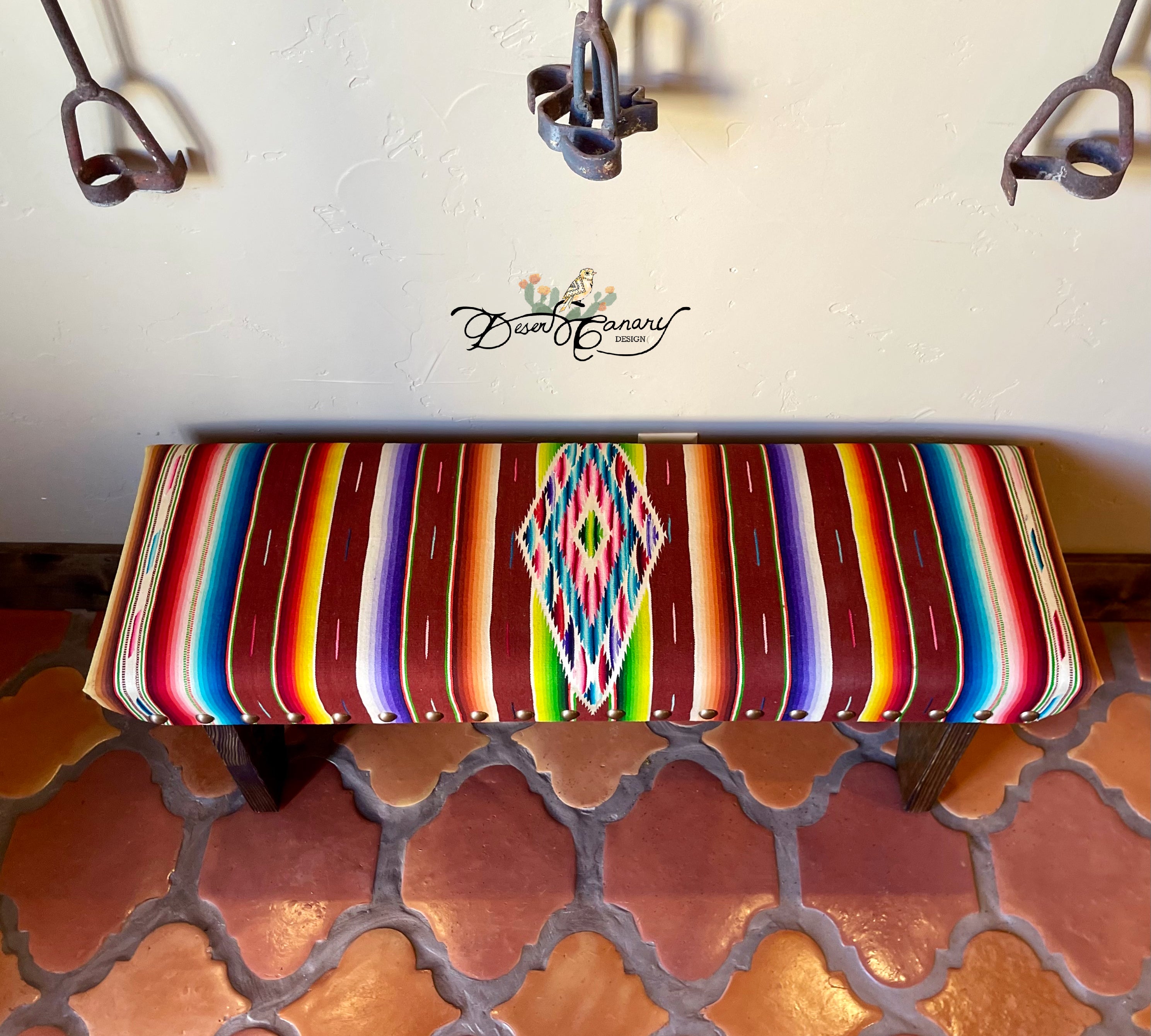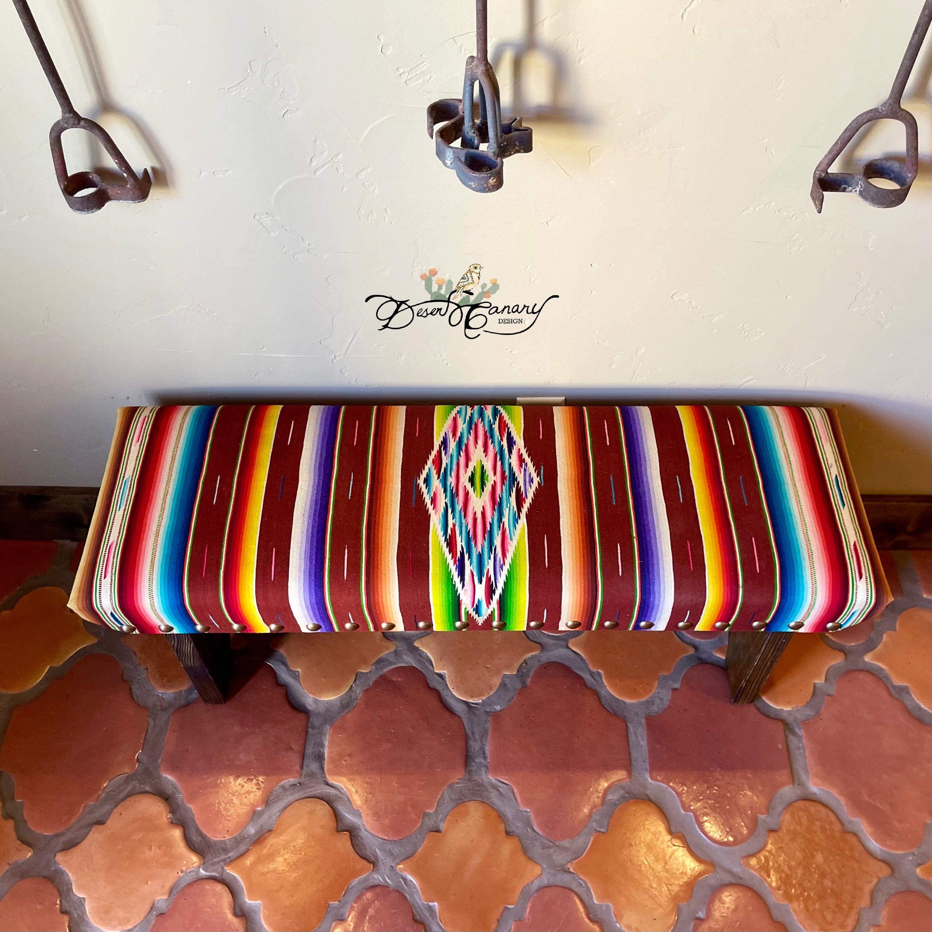 Experience the vibrant charm of Mexico right in the comfort of your own home with this captivating upholstered bench adorned in an authentic hand woven Mexican serape.  The Vintage Serape Blanket Bench is a masterpiece that seamlessly combines cultural heritage, artistic expression, and practical functionality.  The Mexican serape, a handcrafted work of art in itself, serves as the perfect upholstery for this one of a kind bench.  It’s handwoven fabric exudes a distinct texture and durability that guarantees years of comfort and joy.  Each thread tells a story, bringing with it the rich tapestry of Mexican culture, history, and customs.  Perfect for any space in your home, this bold bench effortlessly becomes the focal point of any room.  Whether you are seeking a versatile seating solution or a unique one of a kind statement piece that reflects your wanderlust spirit, the vibrant Saltillo Serape Bench is the answer.  With this enchanting piece in your home, every day is a celebration of life, art, and the joyous spirit of Mexico.