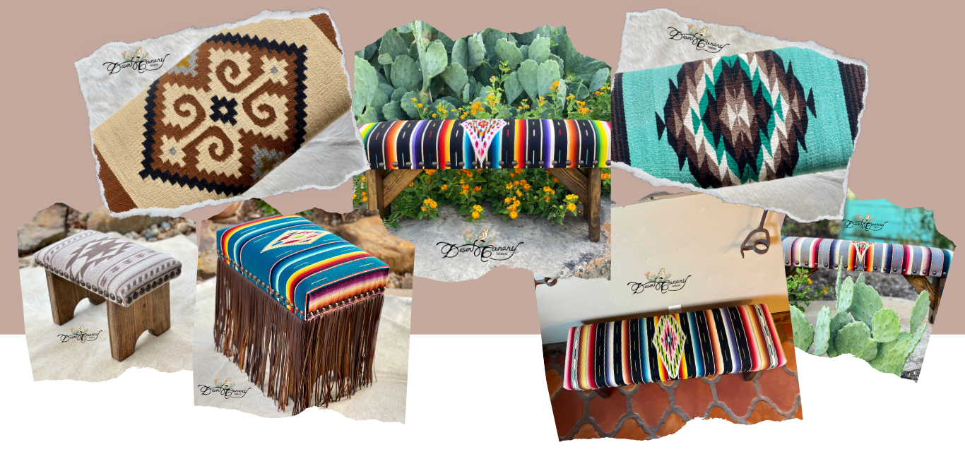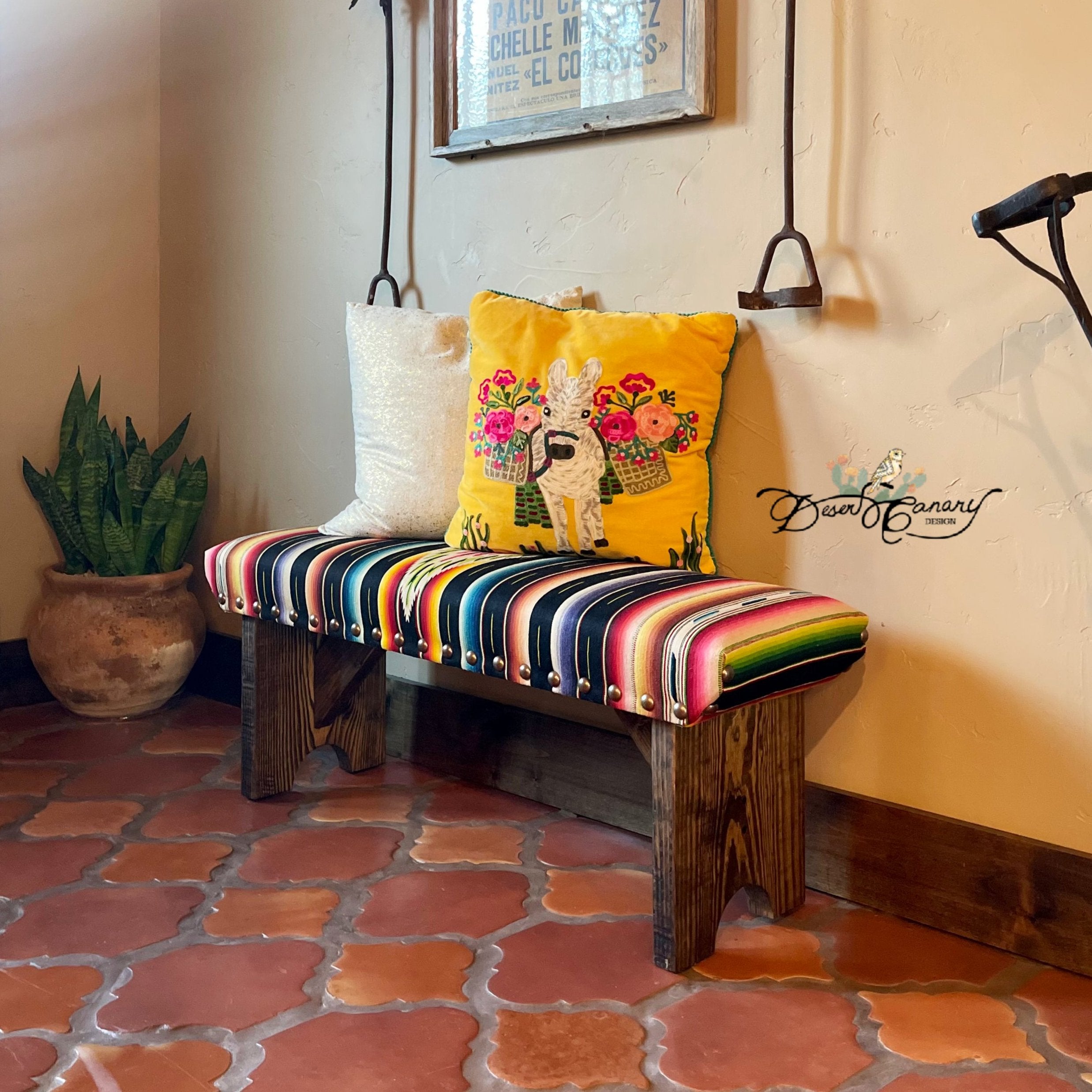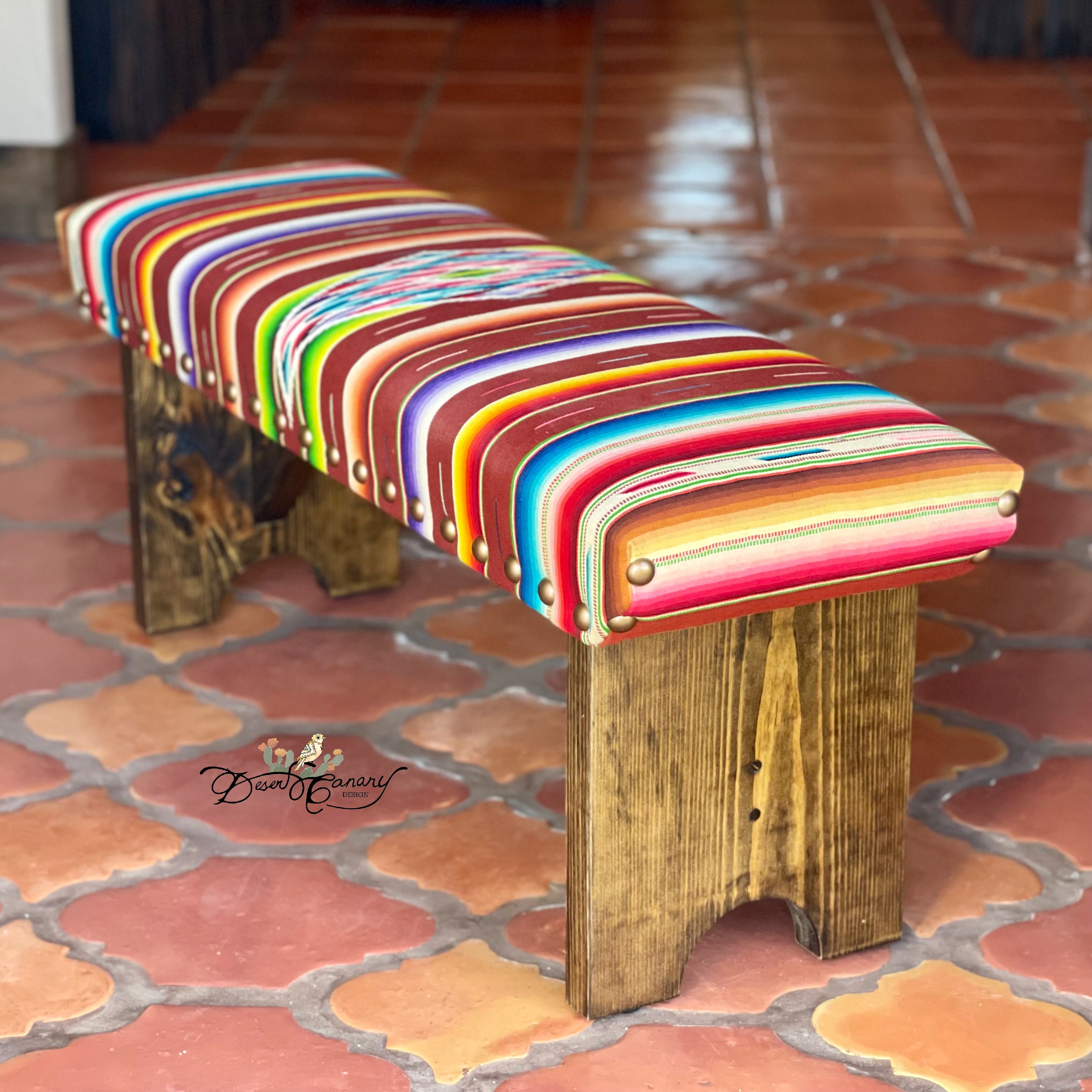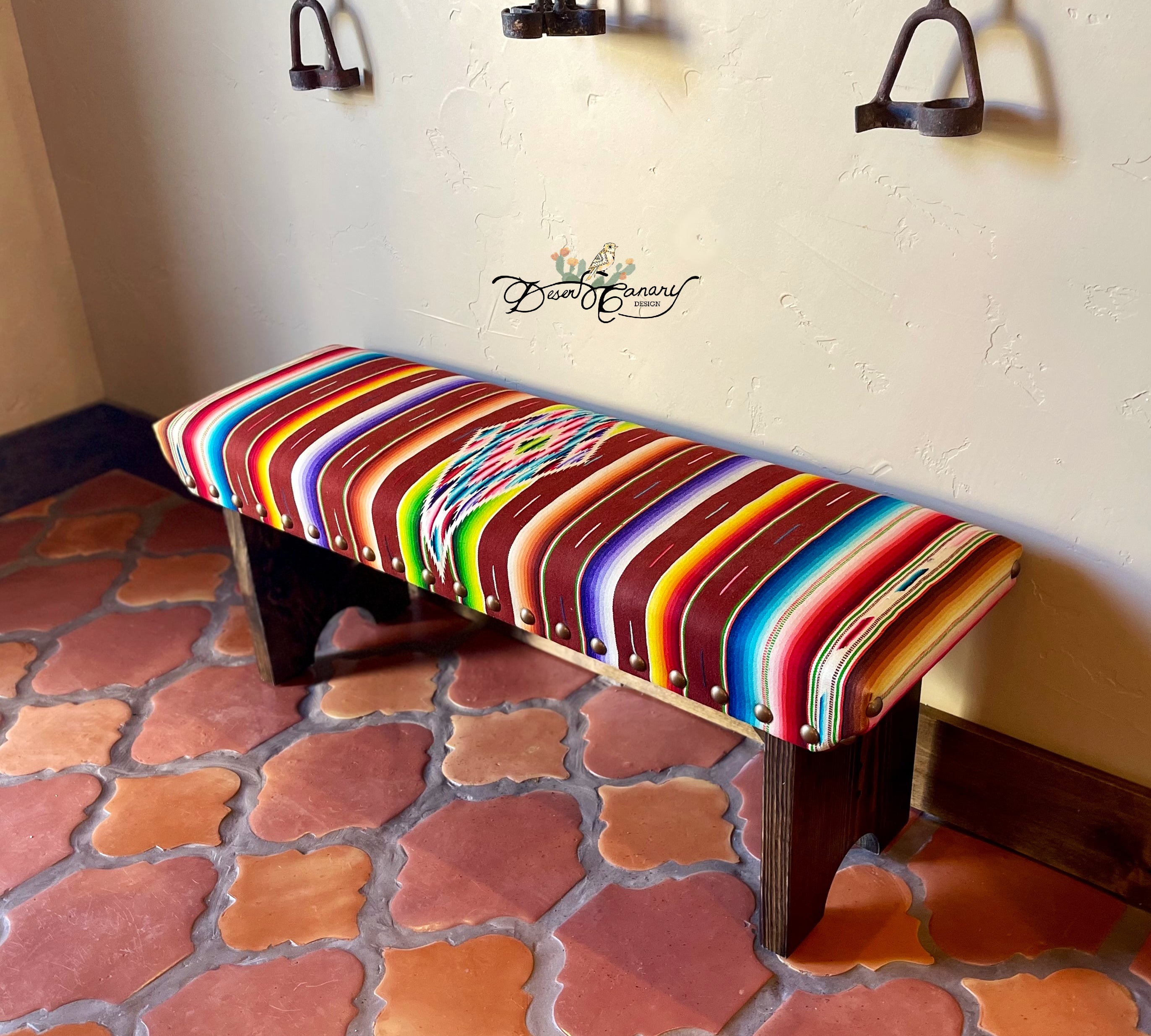 Experience the vibrant charm of Mexico right in the comfort of your own home with this captivating upholstered bench adorned in an authentic hand woven Mexican serape.  The Vintage Serape Blanket Bench is a masterpiece that seamlessly combines cultural heritage, artistic expression, and practical functionality.  The Mexican serape, a handcrafted work of art in itself, serves as the perfect upholstery for this one of a kind bench.  It’s handwoven fabric exudes a distinct texture and durability that guarantees years of comfort and joy.  Each thread tells a story, bringing with it the rich tapestry of Mexican culture, history, and customs.  Perfect for any space in your home, this bold bench effortlessly becomes the focal point of any room.  Whether you are seeking a versatile seating solution or a unique one of a kind statement piece that reflects your wanderlust spirit, the vibrant Saltillo Serape Bench is the answer.  With this enchanting piece in your home, every day is a celebration of life, art, and the joyous spirit of Mexico.