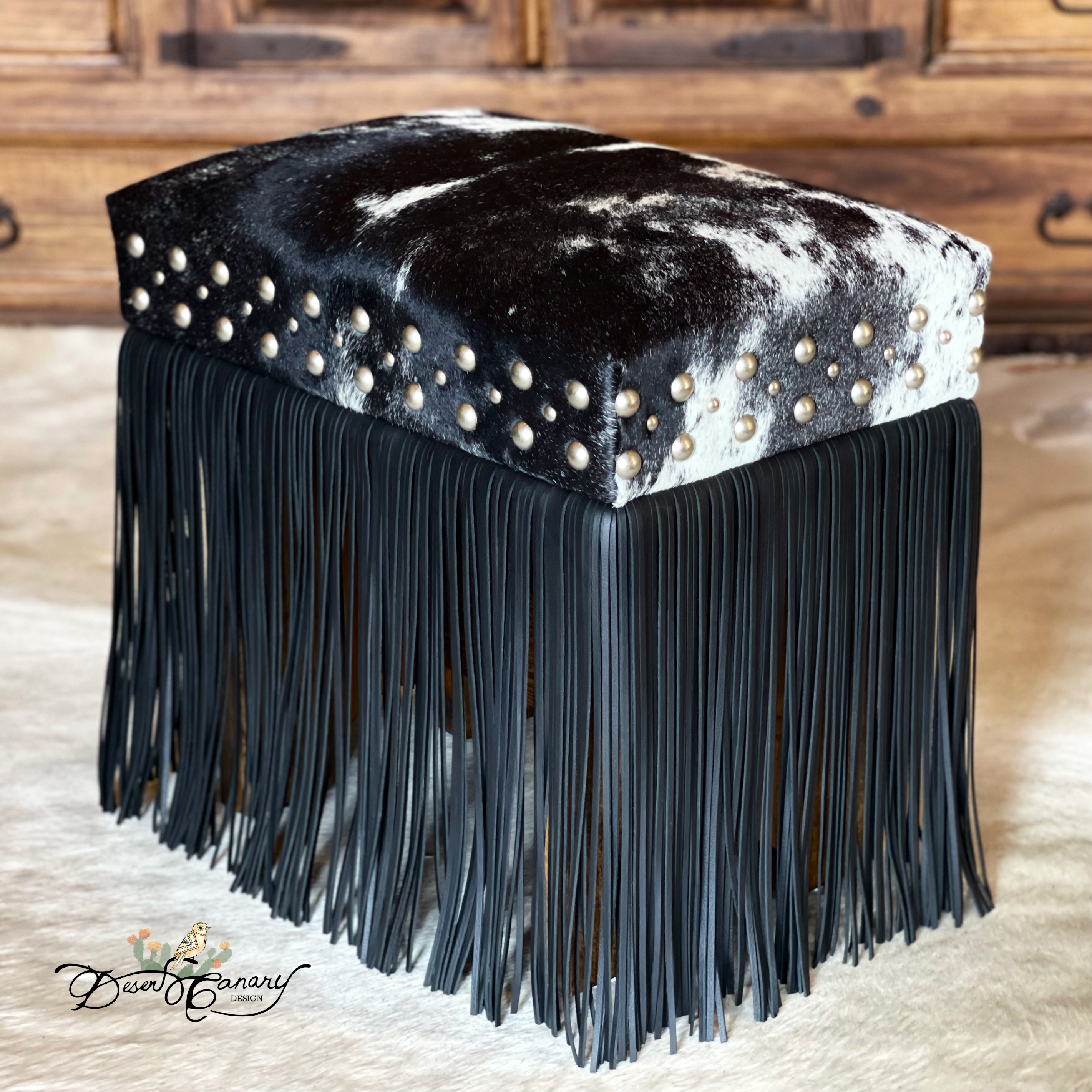 Adding to its allure, lavish hand-cut oiled leather fringe dances around the edge of the solid wood frame.  Each strand of fringe is inspected and trimmed to lightly kiss the floor, creating a captivating visual appearance that beautifully sways, evoking a sense of movement and creating an eye-catching focal point.