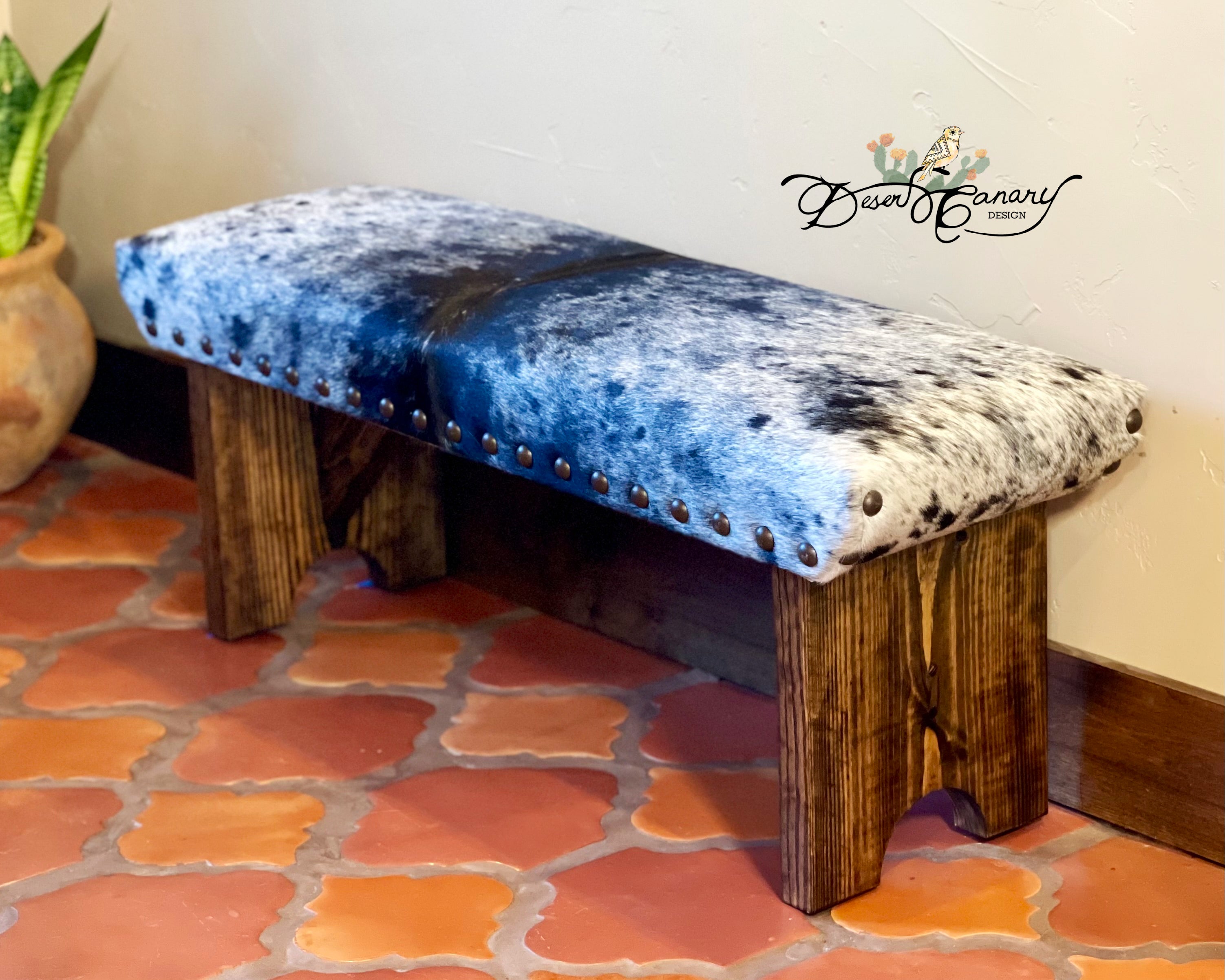 Desert Canary Design’s best-selling signature cowhide bench is a classy and timeless rustic piece of furniture that seamlessly blends western sophistication with natural charm.  Handcrafted to perfection, this bench features a sturdy wooden frame that promises durability and stability, ensuring years of reliable use.  The standout feature of this bench lies in its exquisite upholstery, meticulously handcrafted from premium Brazilian cowhide.  Each cowhide is thoughtfully curated taking into consideration pattern, texture, and color, ensuring an element of individuality to every bench.  The Cowhide Bench serves as much more than just an eye-catching accent; it also offers comfort and practicality.  The padded seat, generously cushioned with 1 inch high-quality foam, provides an inviting spot to sit.  Whether it’s used as a comfy spot to remove boots, a statement piece in the entryway or end of the bed, the Cowhide Bench is the epitome of beauty, craftsmanship, and functionality – a true representation of the harmonious coexistence of nature and design.