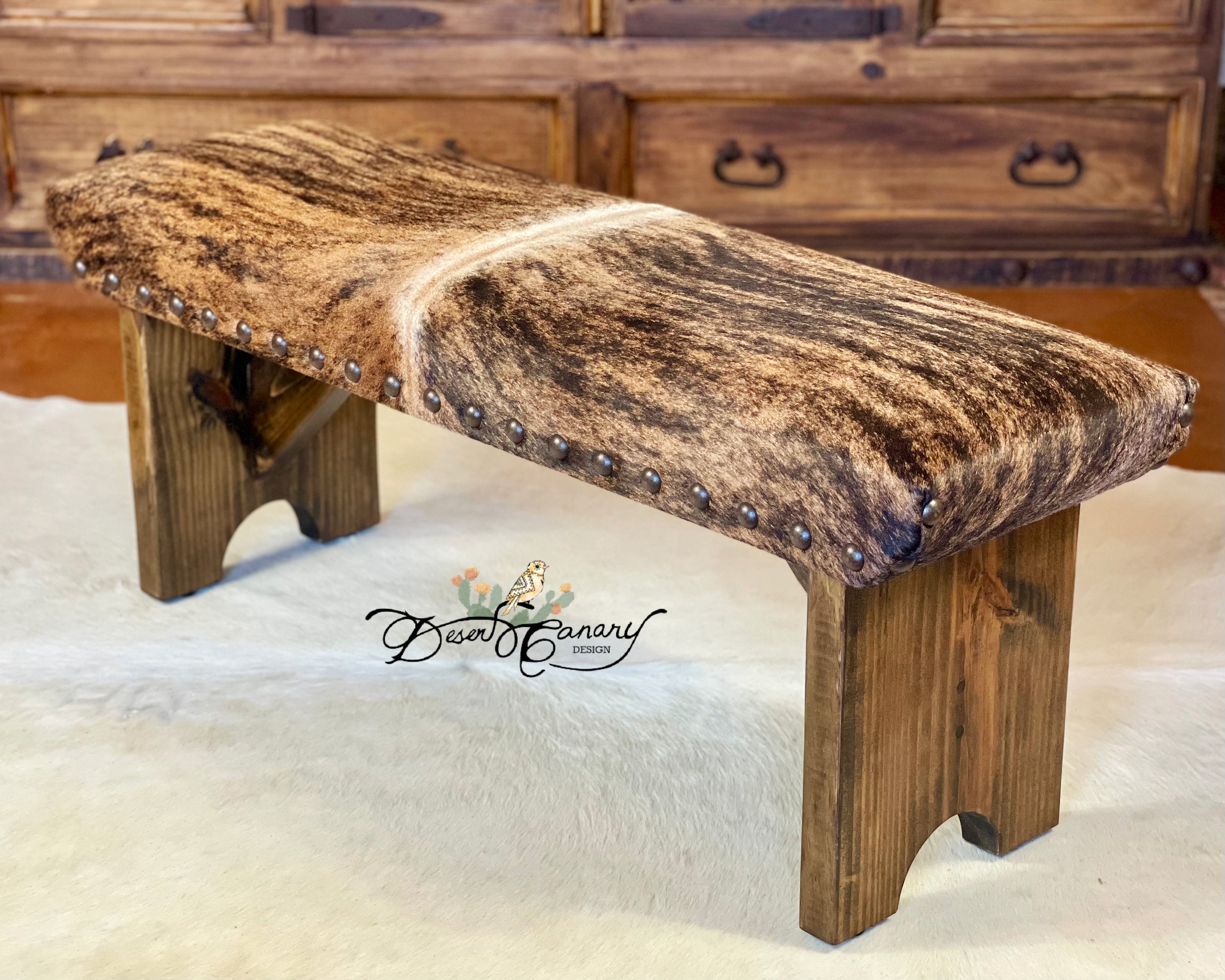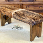 Desert Canary Design’s best-selling signature cowhide bench is a classy and timeless rustic piece of furniture that seamlessly blends western sophistication with natural charm.  Handcrafted to perfection, this bench features a sturdy wooden frame that promises durability and stability, ensuring years of reliable use.  The standout feature of this bench lies in its exquisite upholstery, meticulously handcrafted from premium Brazilian cowhide.  Each cowhide is thoughtfully curated taking into consideration pattern, texture, and color, ensuring an element of individuality to every bench.  The Cowhide Bench serves as much more than just an eye-catching accent; it also offers comfort and practicality.  The padded seat, generously cushioned with 1 inch high-quality foam, provides an inviting spot to sit.  Whether it’s used as a comfy spot to remove boots, a statement piece in the entryway or end of the bed, the Cowhide Bench is the epitome of beauty, craftsmanship, and functionality – a true representation of the harmonious coexistence of nature and design.