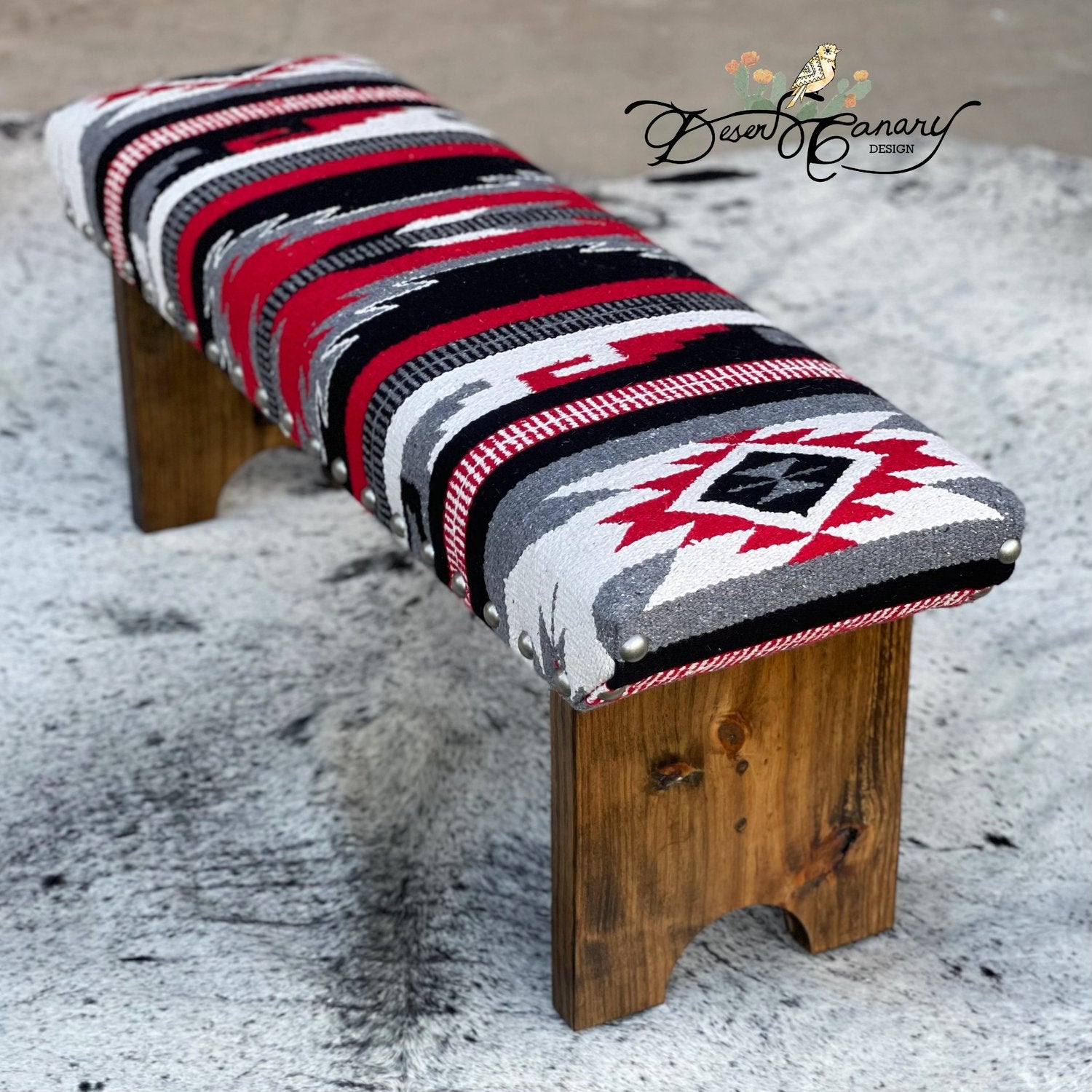 A best seller since 2017, the original Desert Canary Design Blanket Bench was the bench that started it all.  This beautifully curated collection of benches embody the essence of the enchanting Southwest, blending warmth, tradition, and a touch of modernity.  The foundation of the Southwest Blanket Bench is a sturdy, handcrafted solid wood frame.  The wood’s rich hues and unique grain patterns add warmth and authenticity to the overall design.  The true allure of this bench, however, lies in its exquisite upholstery.  Adorned with a vibrant Southwest blanket featuring intricate geometric patterns inspired by ancient tribal motifs tell stories of generations past, paying tribute to a rich cultural heritage.  No matter your decor, there is a Blanket Bench to perfectly elevate your space with color, pattern and texture.  Its timeless appeal and cultural significance will captivate the hearts of those with an appreciation for heritage and a desire to embrace the southwest’s essence in their home decor.   Immerse yourself in the charm and serenity of the Southwest with this remarkable upholstered  bench, a true homage to a vibrant and captivating culture.