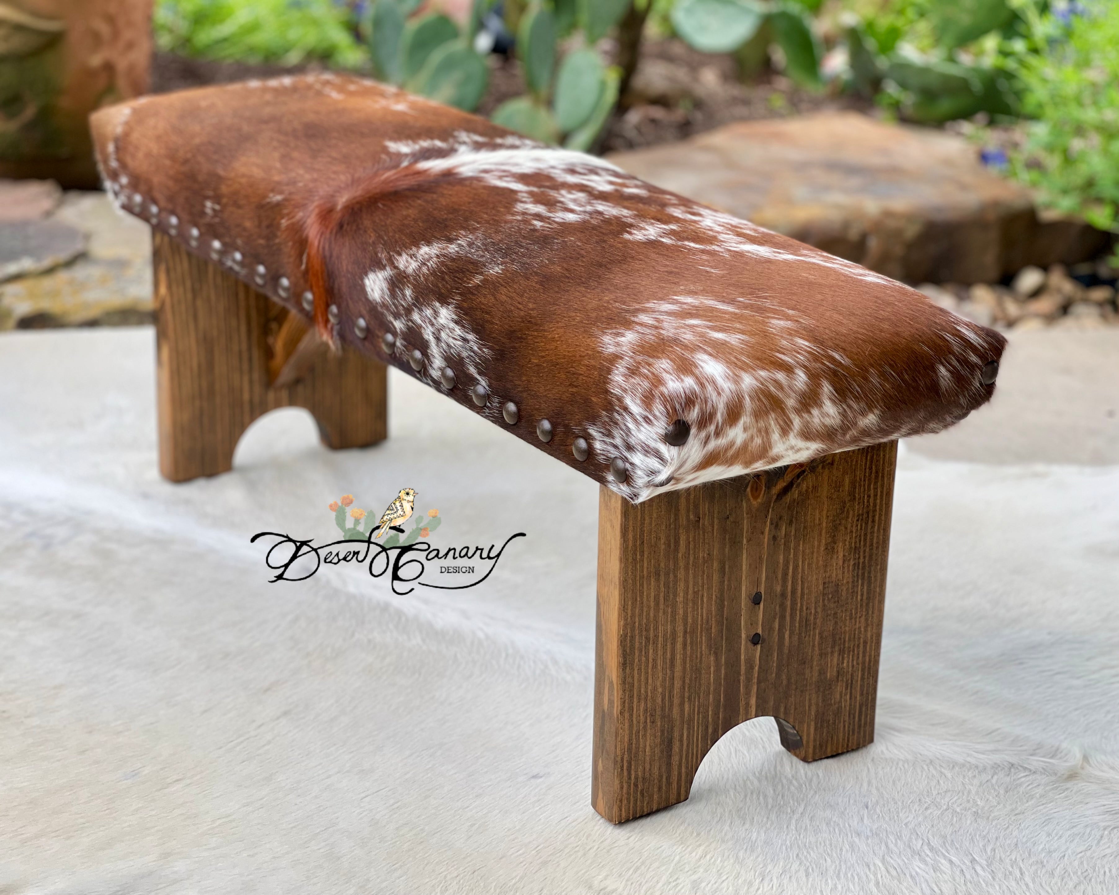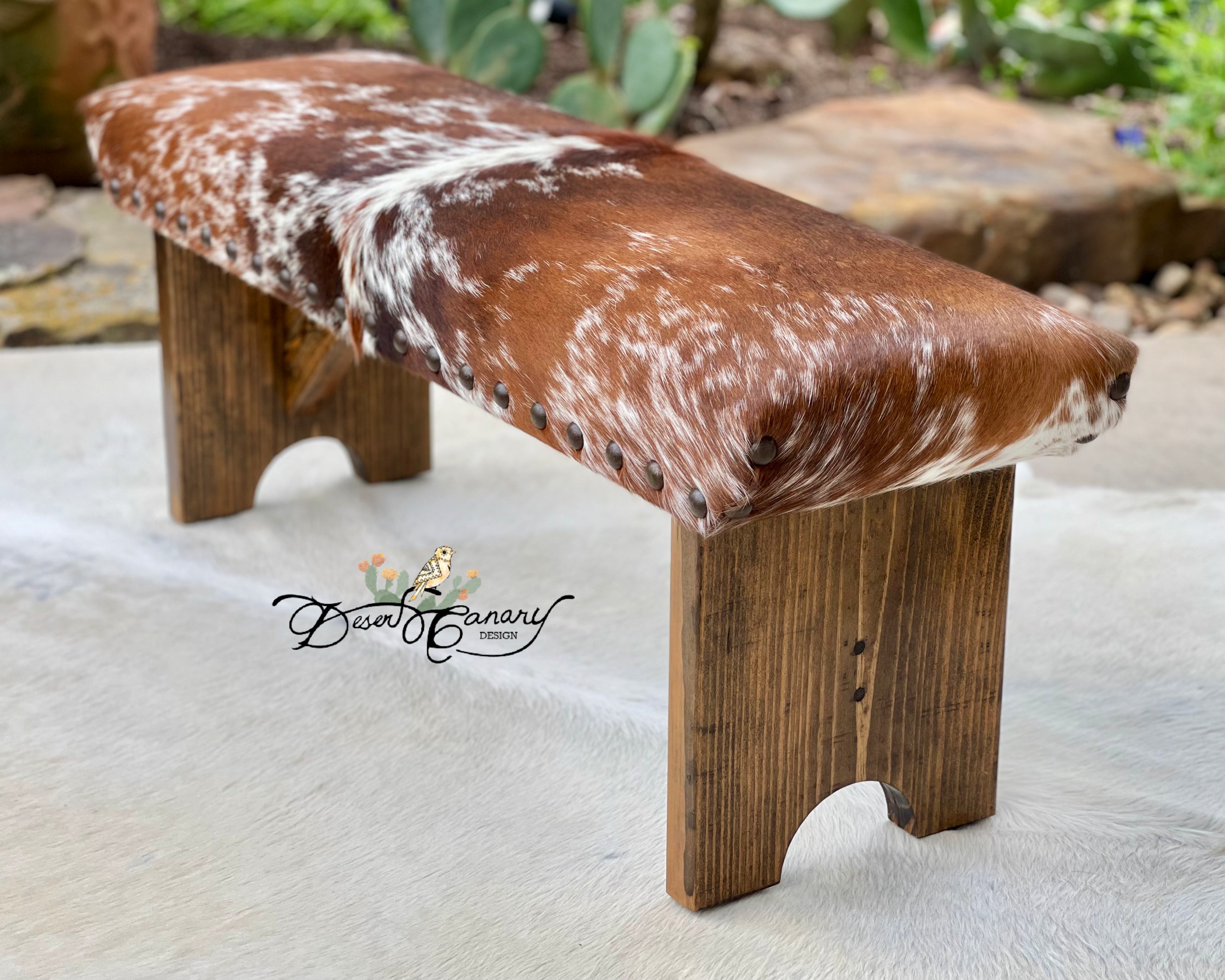 Desert Canary Design’s best-selling signature cowhide bench is a classy and timeless rustic piece of furniture that seamlessly blends western sophistication with natural charm.  Handcrafted to perfection, this bench features a sturdy wooden frame that promises durability and stability, ensuring years of reliable use.  The standout feature of this bench lies in its exquisite upholstery, meticulously handcrafted from premium Brazilian cowhide.  Each cowhide is thoughtfully curated taking into consideration pattern, texture, and color, ensuring an element of individuality to every bench.  The Cowhide Bench serves as much more than just an eye-catching accent; it also offers comfort and practicality.  The padded seat, generously cushioned with 1 inch high-quality foam, provides an inviting spot to sit.  Whether it’s used as a comfy spot to remove boots, a statement piece in the entryway or end of the bed, the Cowhide Bench is the epitome of beauty, craftsmanship, and functionality – a true representation of the harmonious coexistence of nature and design.